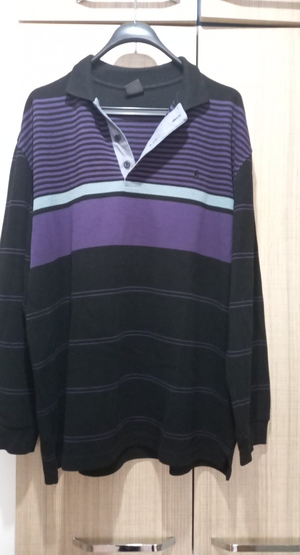 Mor ve siyah çizgili, düğmeli ve yakalı erkek uzun kollu kazak. Rahat kesim, sentetik kumaştan, günlük sokak stili için uygun.