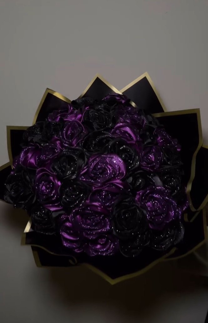 Koyu mor ve siyah çiçek desenli, fırfırlı detaylara sahip cesur gotik tarzda kadın broş, düğün için uygun.