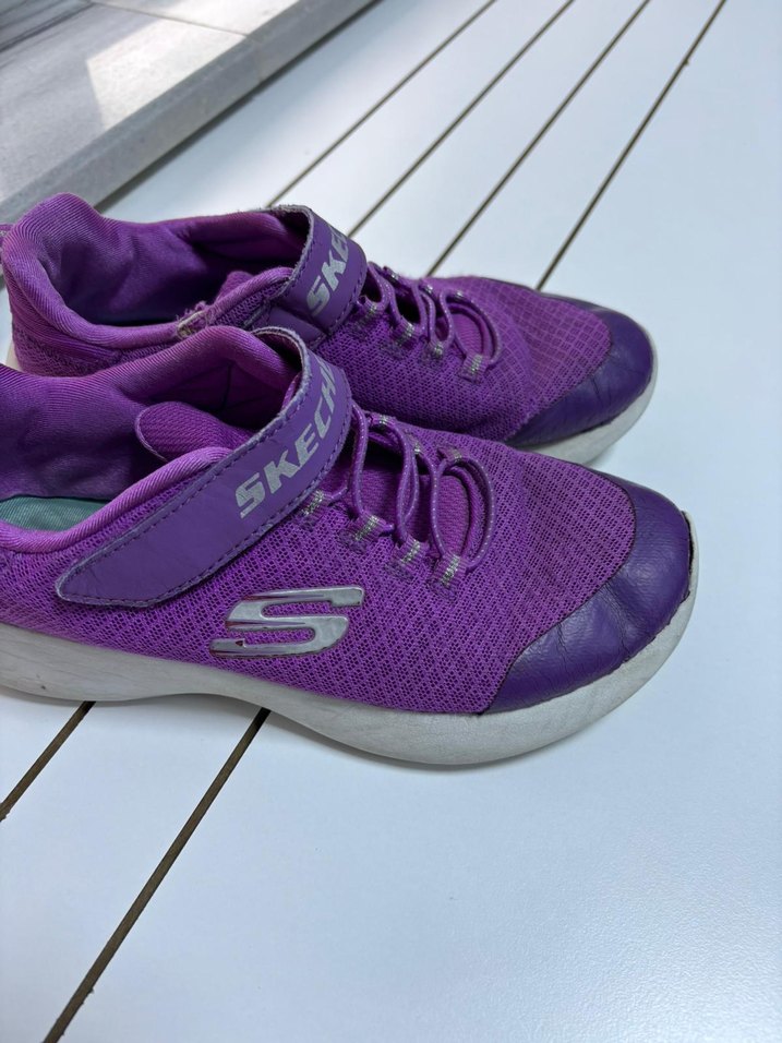Mor Skechers kız çocuk spor ayakkabısı, cırt cırtlı ve kauçuk tabanlıdır. Günlük sokak stiline uygundur, rahat ve kullanımı kolaydır.