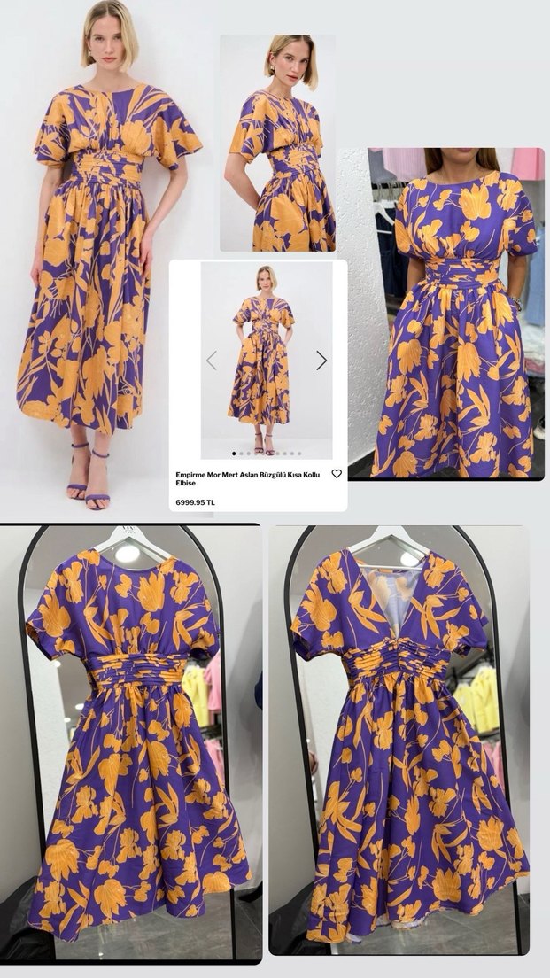 ADL marka muadil Mor ve domob canlı çiçek desenli, ve kısa kollu, sentetik kumaştan uzun, bol kesim, drapeli elbise. Günlük kullanıma uygun, şık bir tercih.