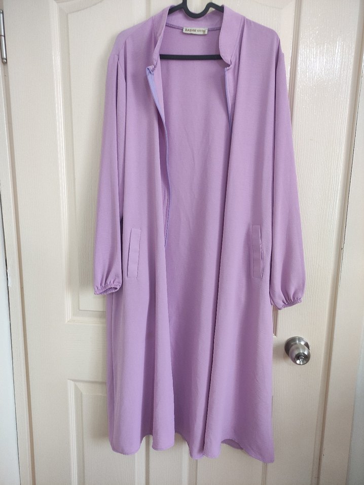 Mor renkte, koyu soyut desenli tunik, Üzerinde '46, BASAR GiYiM' etiketi bulunur.