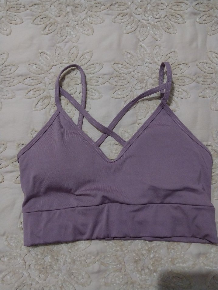 Mor renkli, çapraz ince askılı spor sütyeni, yumuşak ve rahat kumaştan, sokak giyim tarzına uygun.Bedene uymadıgı için kullanılmadı.