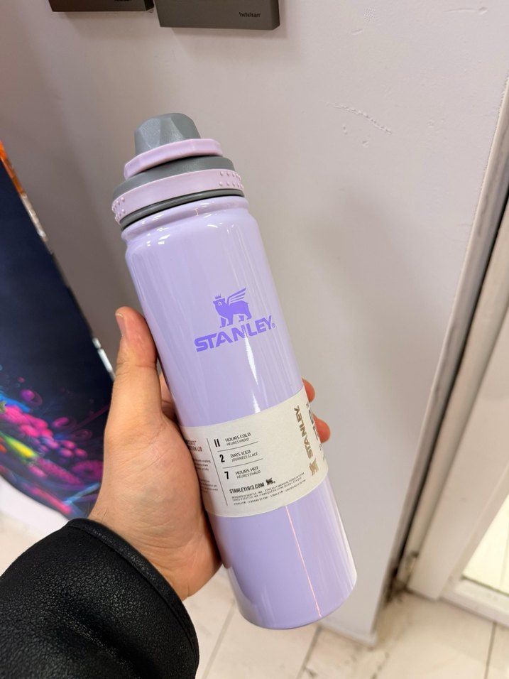 Pastel mor renkte Stanley termos şişesi, sağlam kapak ve dayanıklı yapıya sahip, içecekleri sıcak veya soğuk tutar.
