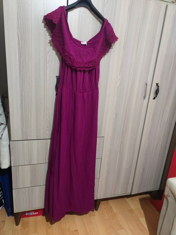 Mor renkli, straplez uzun elbise, bol kesim ve fırfırlı detaylara sahiptir. Sentetik kumaştan yapılmış, bohem tarzda romantik akşamlar için uygundur. İçi astarlı