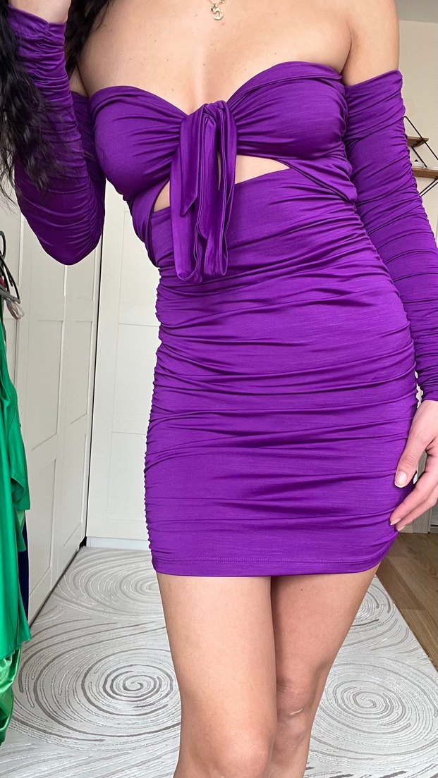 Mor, straplez, drapeli mini elbise. İnce askılı ve satenimsi kumaştan, romantik gece için uygundur.