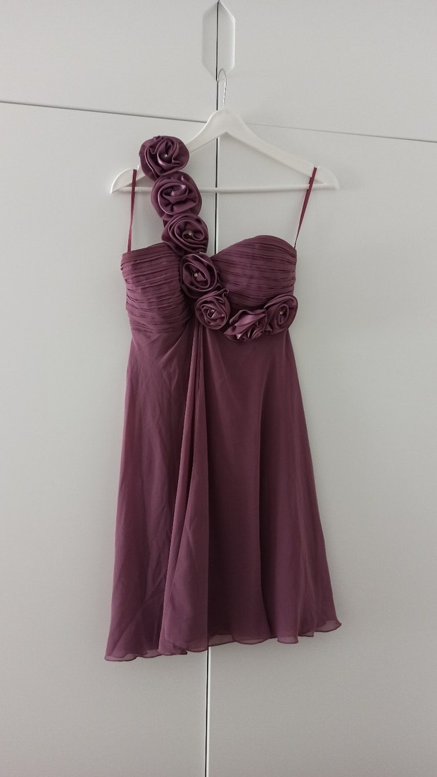 Mor renkte, straplez ve drapeli tasarıma sahip, çiçek detaylı, midi uzunlukta, ince askılı ve vücuda oturan modern klasik abiye elbise.