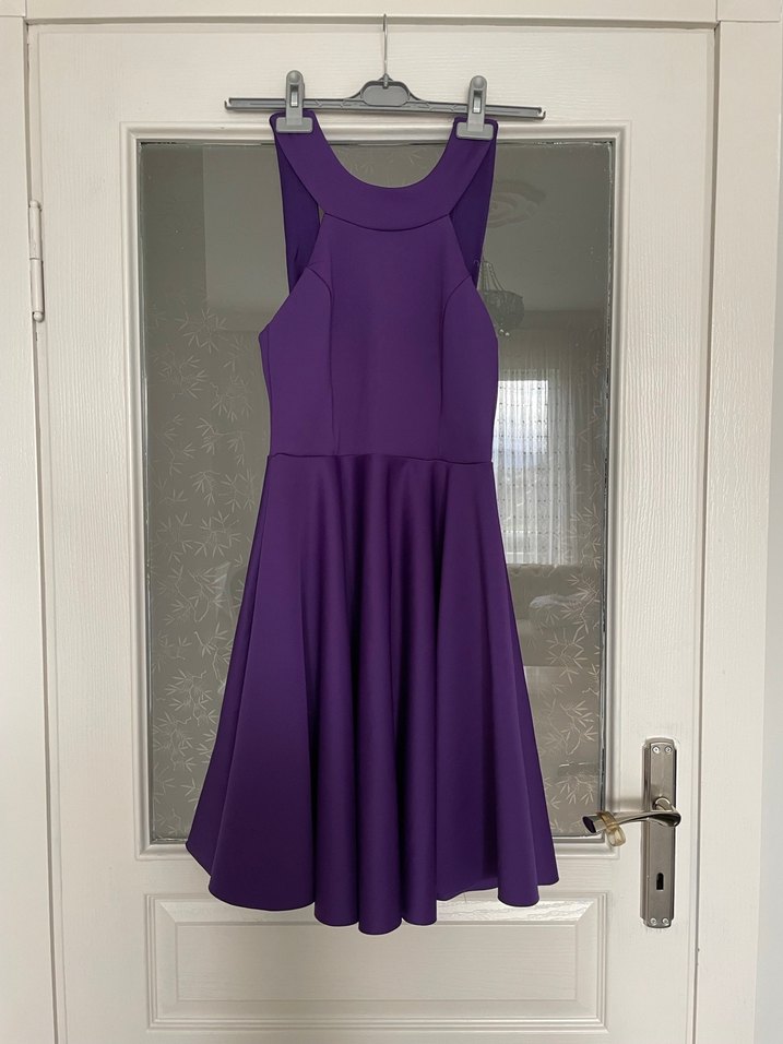 Mor renkte, straplez yaka ve kolsuz tasarıma sahip, drapeli ve vücuda oturan midi elbise. Romantik akşamlar için ideal.