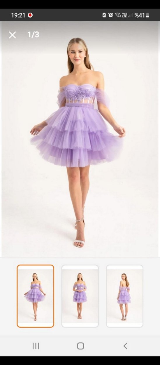 Mor renkli straplez, askılı kısa abiye elbise, fitted kesim ve kat kat fırfır detaylarına sahiptir.bir kere giyildi neredeyse yeni.40 beden L