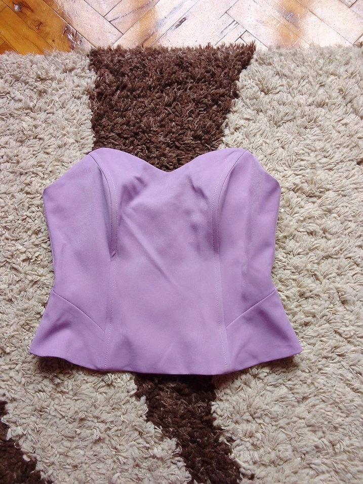 Pastel mor renkli, straplez, kısa kesim ve vücuda oturan sentetik kumaştan yapılmış büstiyer, rahat ve şık bir görünüm sunar. boyu 25 cm