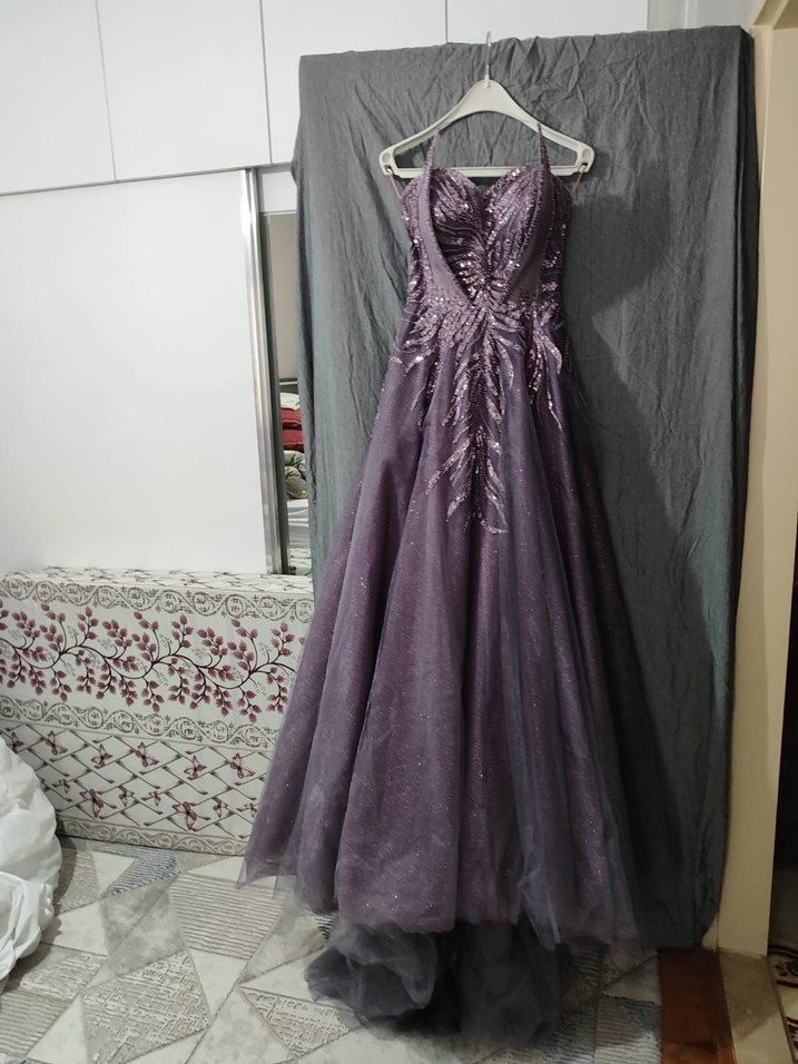 Mor renkte, straplez ve nakış işlemeli, drapeli uzun abiye elbise, gotik düğünler için ideal bir seçimdir. ayakkabı 37 numara elbise içinde 2 tane tarlatan var