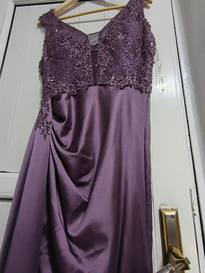 Mor renkli, straplez ve sırtı fermuarlı uzun abiye elbise. Nakış detaylı, drapeli ve parlak kumaştan, şık ve gösterişli tasarım. Sleeveless ve klasik tarzda. Saten yırtmaçlı abiye.