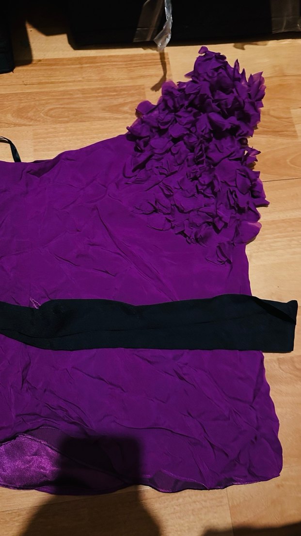 Koyu mor renkli, tek omuz çiçek detaylı v yaka ve volan detaylı, ve vücuda oturan abiye bluz, avant-garde parti tarzı için uygun.beli siyah şifon kemer