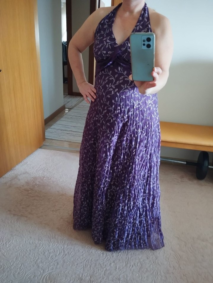 Koyu mor renkli, straplez uzun elbise, vücuda oturan kesimi, drapeli ve kolsuz tasarımı ile romantik akşamlar için uygundur.