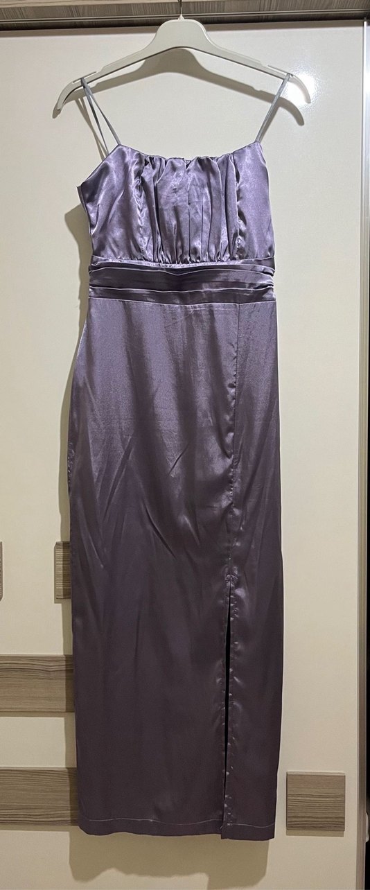 Uzun ve vücuda oturan bu abiye elbise, straplez yaka ve drapeli detaylara sahiptir. Mor rengi romantik akşamlar için şık bir dokunuş sunar. Kumaşından dolayı ufak tefek defoları var.