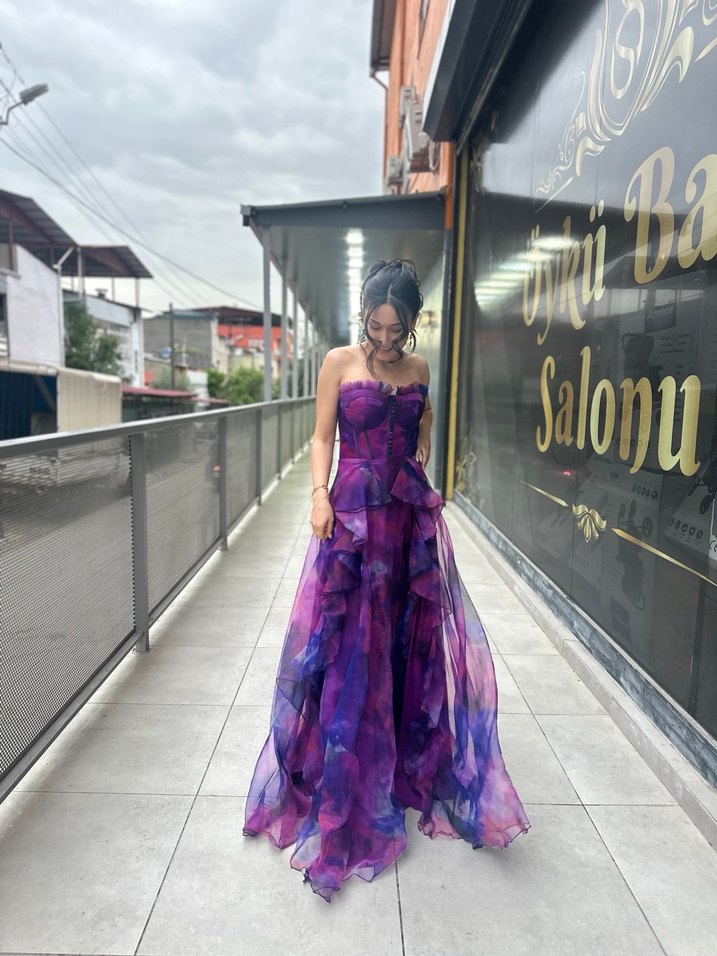 Mor straplez uzun elbise, drapeli tasarımı ve bağlama desenleriyle avant-garde düğünler için uygun şık bir seçimdir. S ve M bedene uyumludur arkası iple ayarlanabilir