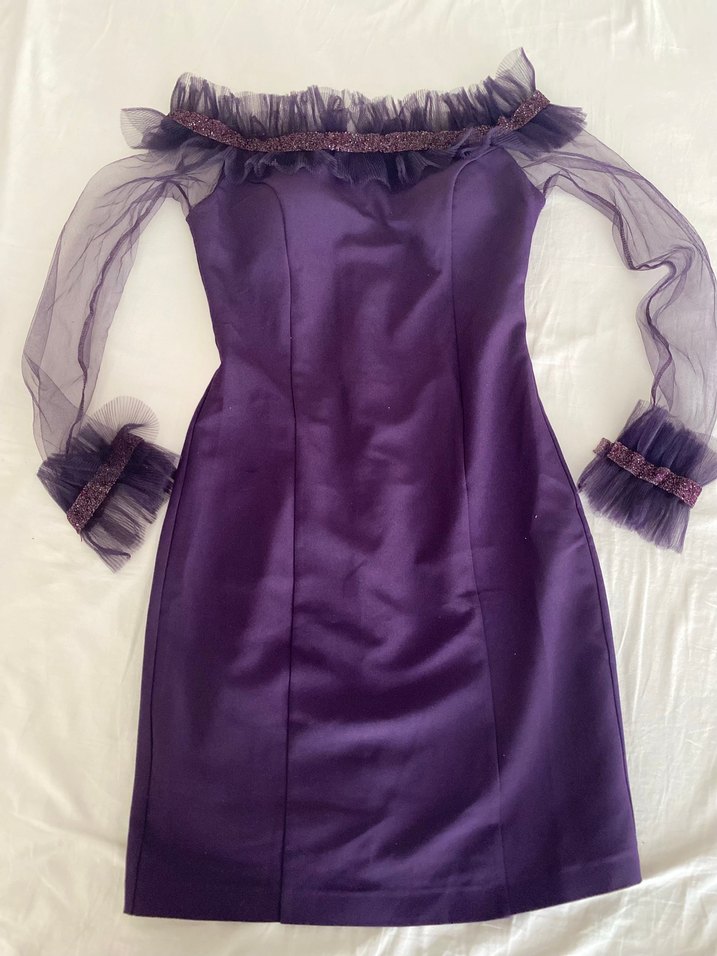 Bu dar kesim koyu mor gece elbisesi, straplez yaka ve fırfırlı detaylarla birlikte şeffaf uzun kollara ve fırfırlı manşetlere sahiptir bir defa giyildi çok iyi durumda