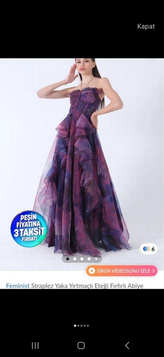 Mor renkli, straplez yaka, yırtmaçlı ve fırfırlı etek detaylı uzun elbise. Salaş kesimi ve batik deseni ile şık bir tasarıma sahiptir.