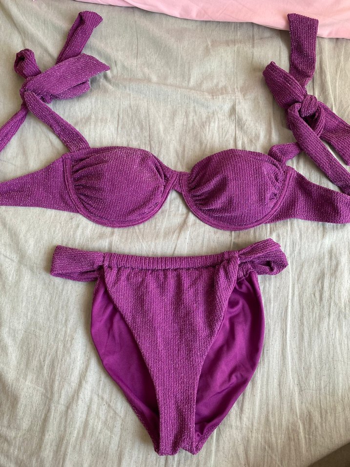 Mor renkte, strappy askılı, bohem tarzda ve fitted kesime sahip bikini takımıdır. Şık bir görünüm sunar.