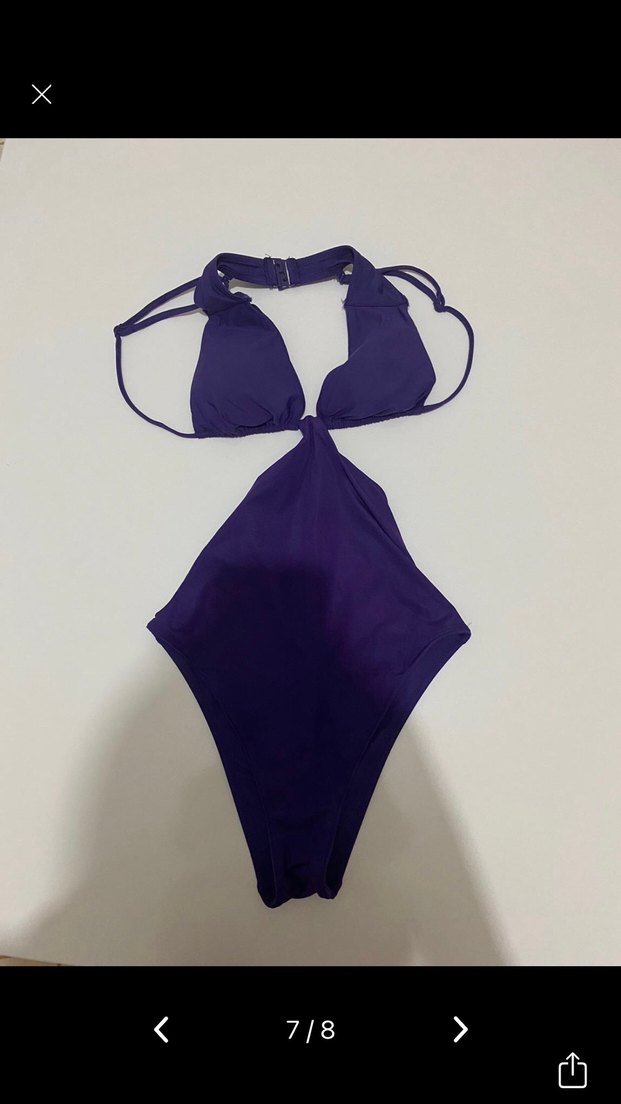 Bu mor, strappy ve tokalı detaylara sahip kadın mayo, minimalist goth tarzıyla plaj için uygundur.