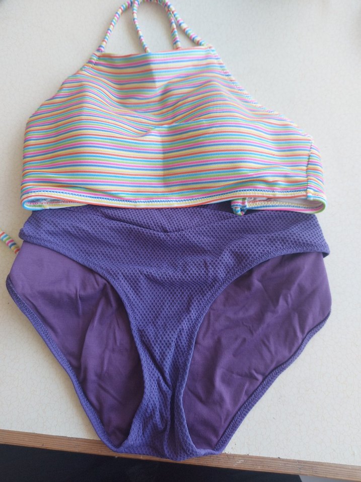 Bu kadın mayosu, pastel mor alt ve renkli çizgili üst kısmıyla, strappy ve vücuda oturan tasarıma sahip, cesur plaj görünümü için ideal. ️42/44