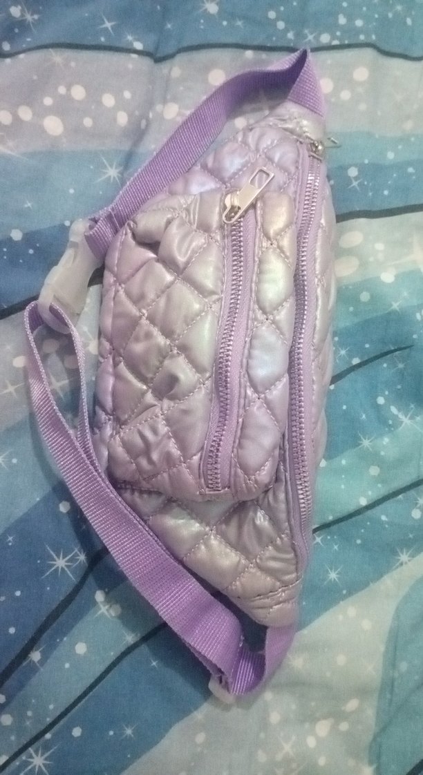 Mor pastel tonlarda, sentetik kumaştan, fermuarlı ve kapitone dokulu kadın çapraz çanta, street wear tarzına uygun.