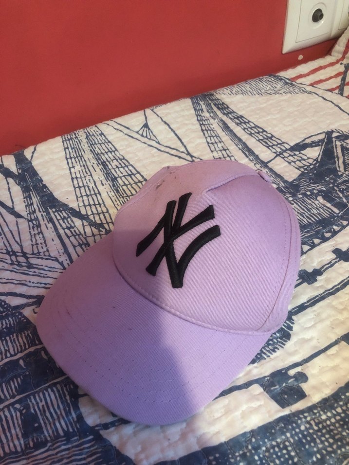 Pastel mor renkli, sentetik kumaştan yapılmış kadın street wear şapka. Siyah büyük logo ve ayarlanabilir Velcro bant içerir. Trendy casual stil için uygun.