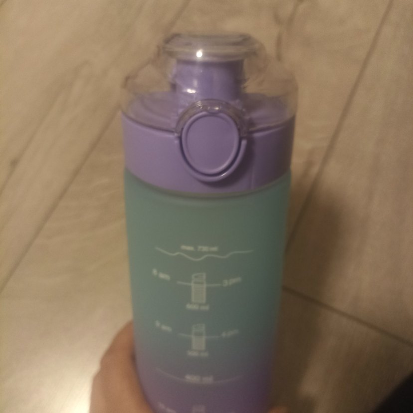 Açık mor renkte, günlük su tüketimini 200ml'den 800ml'ye kadar zaman ve ölçü işaretleriyle takip eden su şişesi. 8:00-19:00 saatleri arasında işaretli.