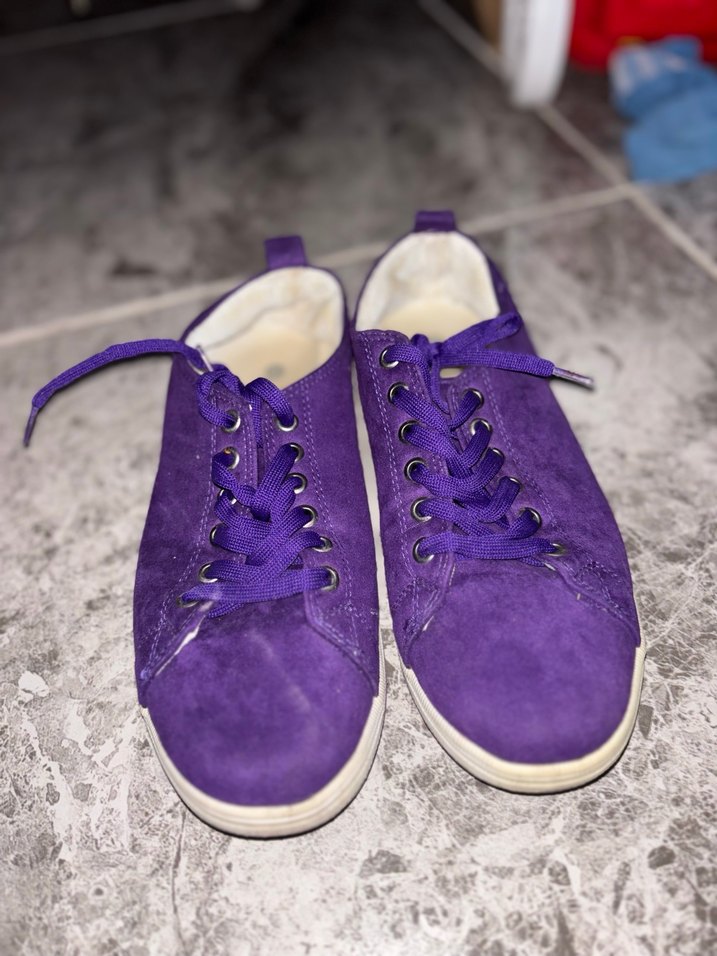 Düz tabanlı, bağcıklı mor süet kadın sneakers, günlük rahat kullanıma uygun, trend sokak stilinde.