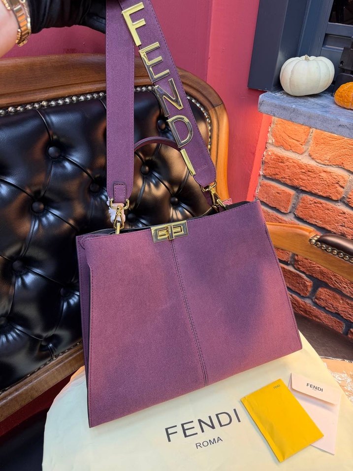 Koyu mor süet malzemeden yapılmış, tokalı ve 'FENDI' baskılı geniş askıya sahip çanta. Minimalist ve cesur sokak stili için uygun, günlük kullanıma ideal. 'FENDI ROMA' markası bulunur.