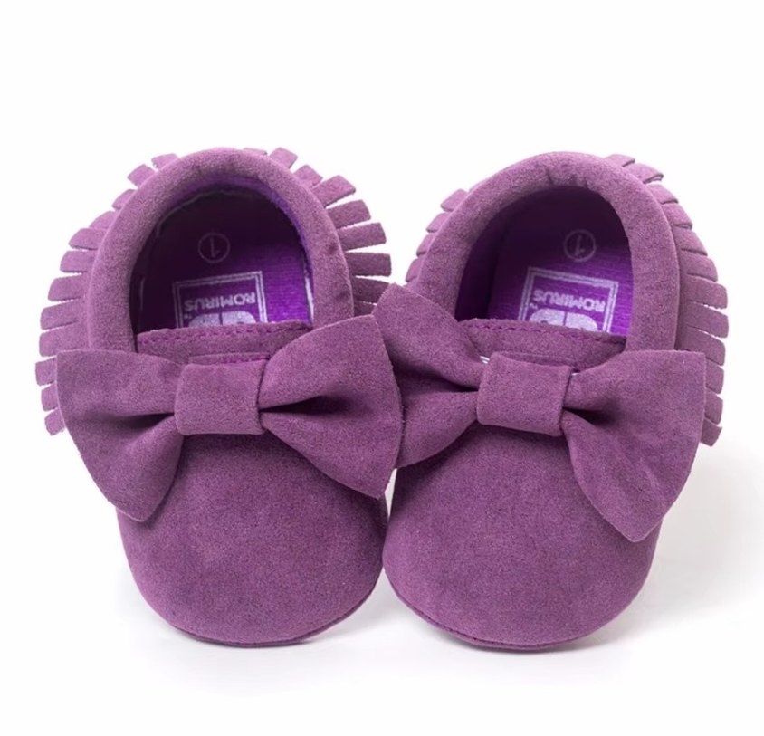 Mor süet bebek ayakkabıları, fiyonk detaylı ve yumuşak dokuludur, sade bohem tarzında tasarlanmıştır.