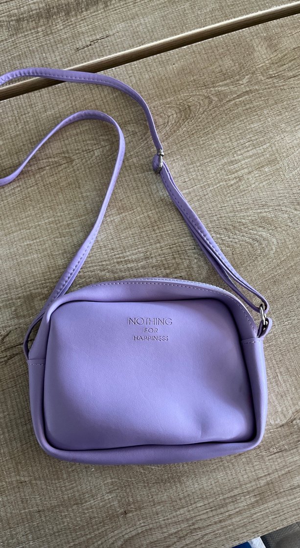 Pastel mor süet çapraz çanta, fermuarlı ve baskılı minimalist tasarıma sahiptir. Trendy casual tarzı ve günlük kullanım için uygundur. Önünde "NOTHING FOR HAPPINESS" yazısı bulunur.