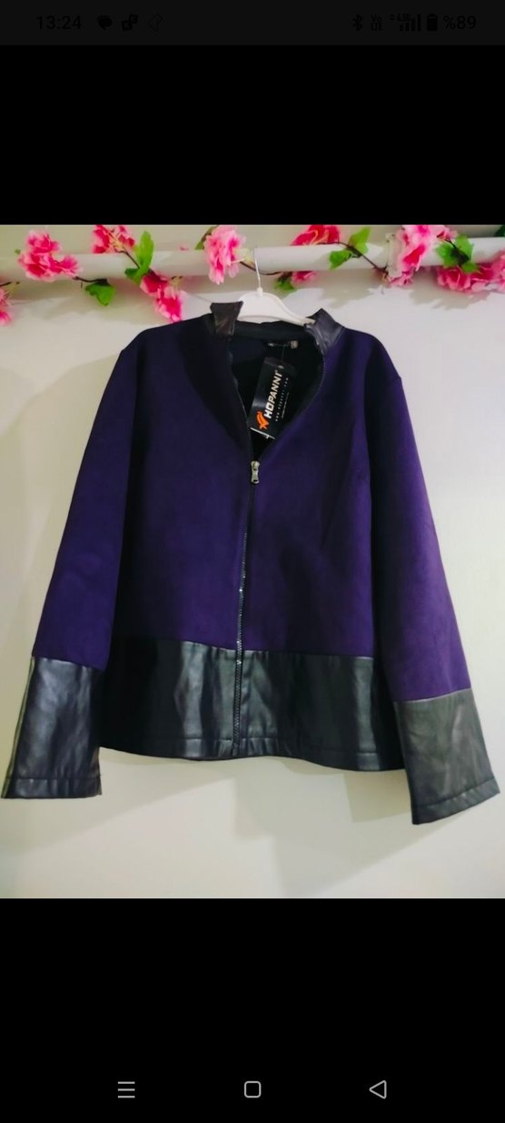 Mor renkte, uzun kollu, fermuarlı ve süet-leather detaylı kadın deri ceket. Notlu yaka ve midi boyuyla günlük kullanıma uygun, regular fit tarzda.iki koltuk arası 51 cm, boyu 62.hem şık hem tarz