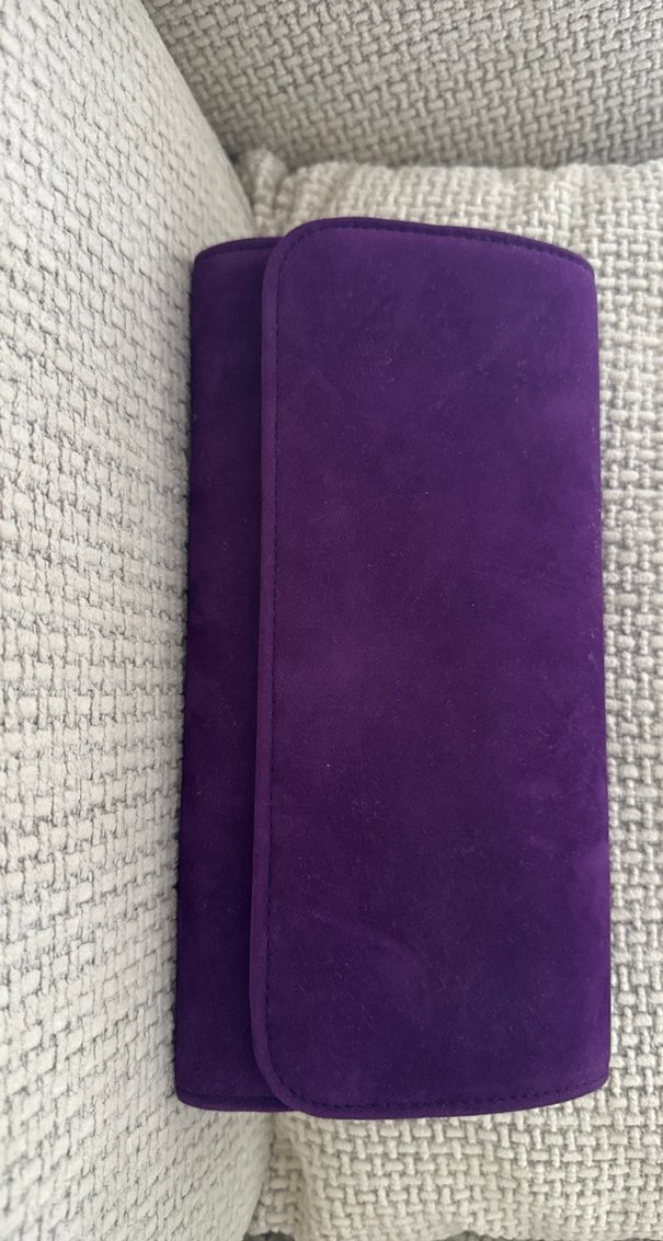Koyu mor süet malzemeden yapılmış, cırt cırtlı kapamalı, minimalist ve çağdaş tasarıma sahip kadın portföy çanta.