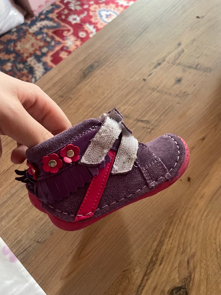 Mor süet kız çocuk botu, renkli nakış detayları ve Velcro kayışlarla. Çiçek ve tüy süslemeleriyle bohem ve retro tarzda.
