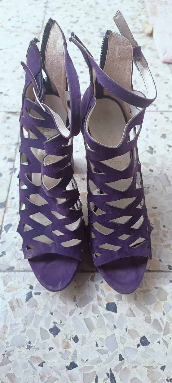 Mor süet malzemeden yapılmış, platform topuklu ve tokalı kadın akşam ayakkabıları gotik tarzda, günlük kullanıma uygun.