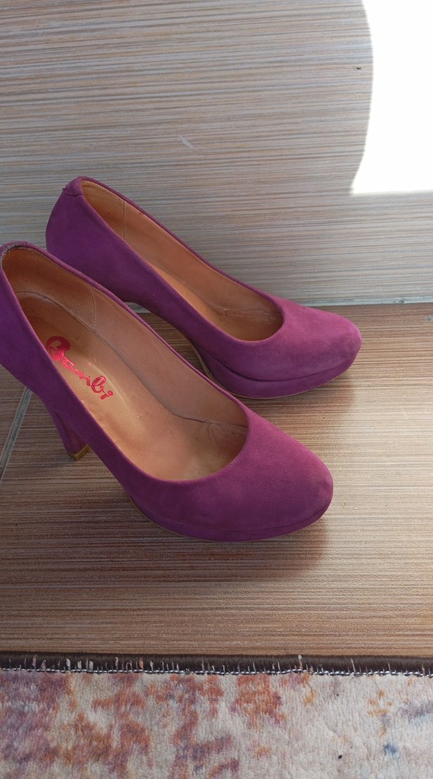 Mor süet platform topuklu stiletto, tokalı detaylı, cesur ve çağdaş tarzda, romantik buluşmalar için uygun.