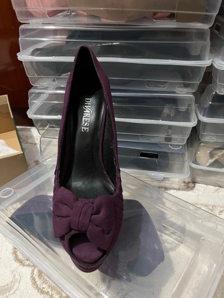 Ofis için uygun, koyu mor süet stiletto topuklu, tokalı ve minimalist tarzda cesur kadın ayakkabısı.