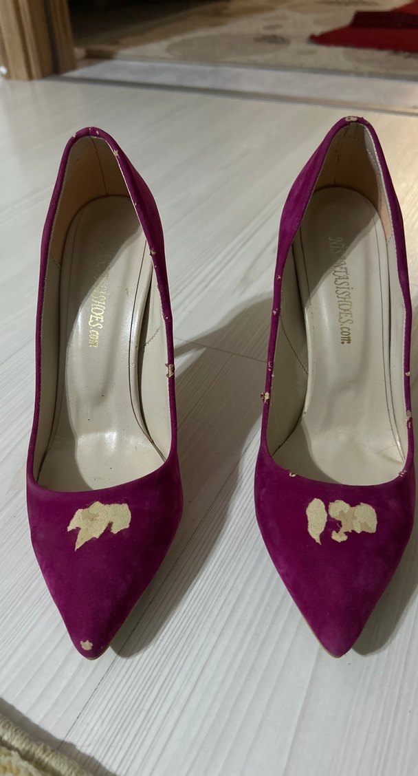 Mor süet malzemeden yapılmış, parlak görünüme sahip, tokalı stiletto topuklu kadın ayakkabısı. Düğünlerde kullanılabilir, baskılı desene sahiptir. 10.50 cm dir