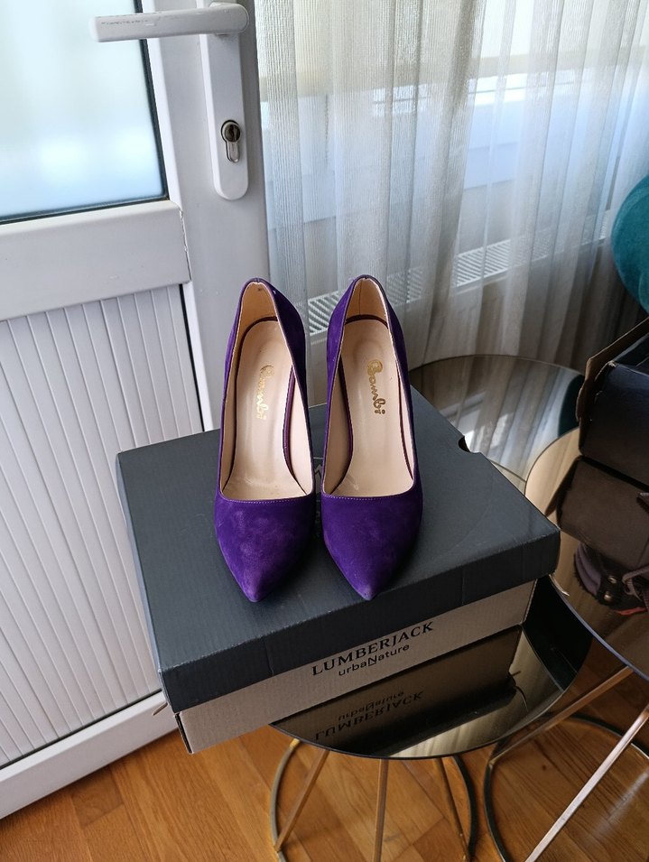Mor süet malzemeden yapılmış, desen içermeyen stiletto topuklu ayakkabılar. Romantik akşamlar için zarif ve modern bir şıklık sunar.