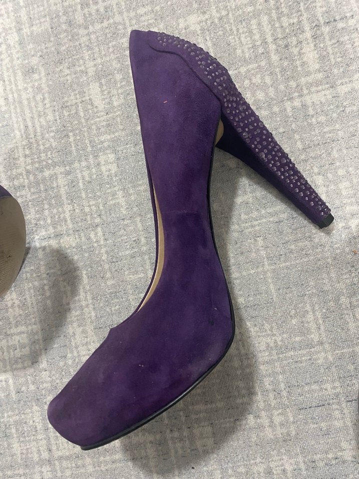 Mor süet kadın stiletto, yüksek topuklu ve topuk kısmında taş detaylıdır. Romantik gece için uygundur. 2 kere giyildi dolapta durmaktan iç kısmında yapısan tozlar var