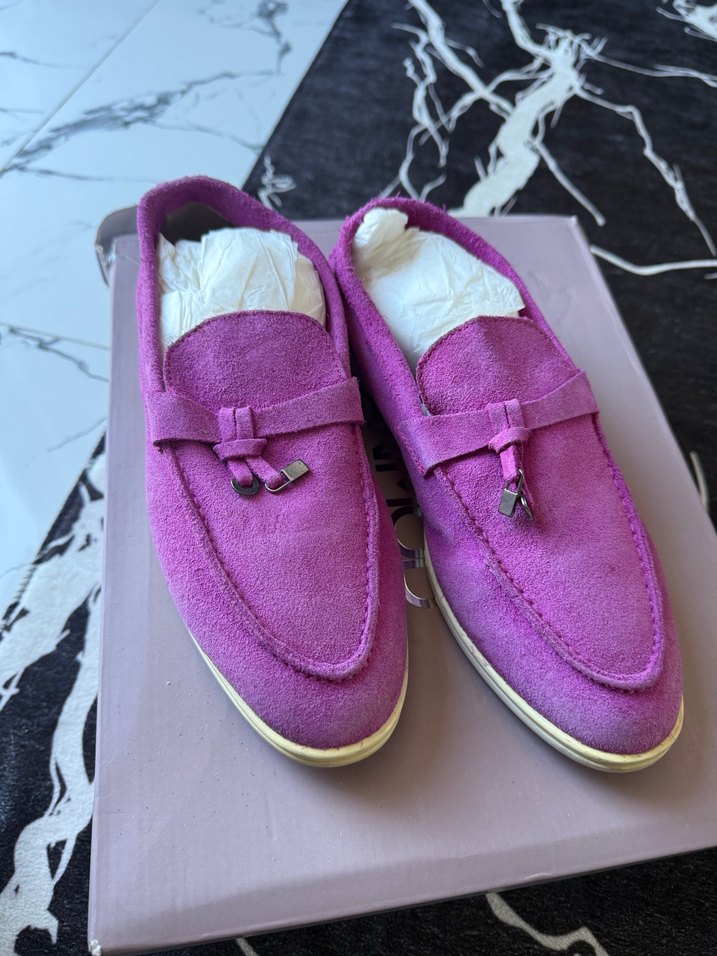 Mor süet malzemeden tokalı, düz tabanlı kadın loafer. Günlük rahat sokak stiline uygun, pastel tonlarda minimal tasarım. ufak bir sökük mevcut