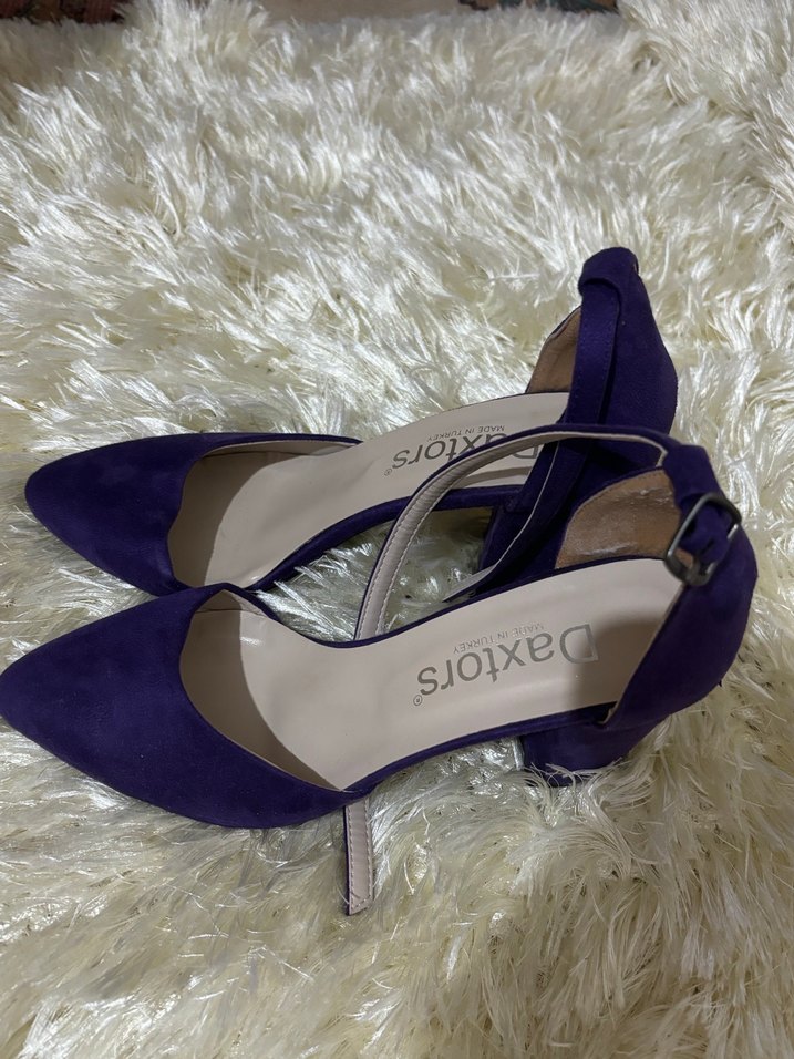 Koyu mor süet blok topuklu, tokalı ve desenli kadın ayakkabısı, gösterişli düğünler için uygundur.