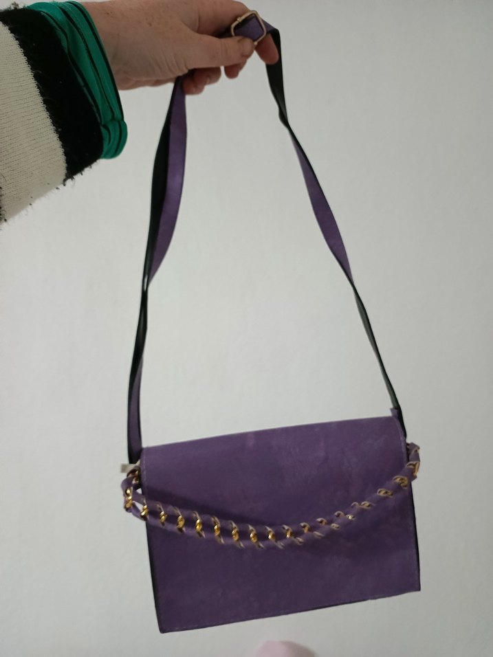 Mor süet malzemeden yapılmış, yılan desenli ve zincir detaylı kadın çantası. Bohem tarzda, günlük kullanıma uygun. Ürün birkaç kez kullanıldı