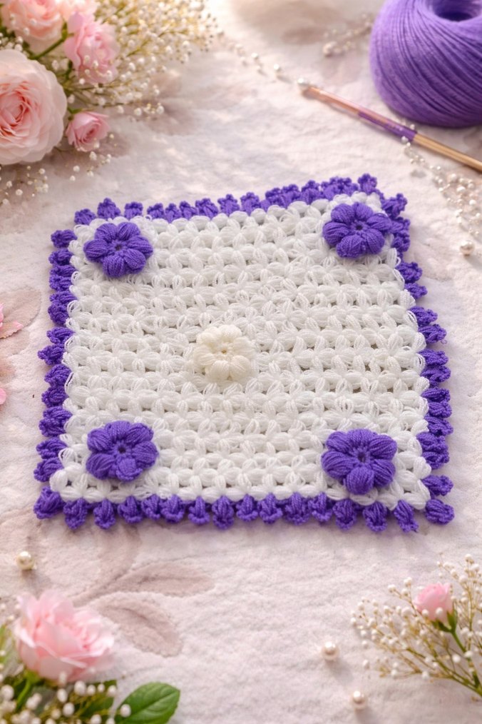 Beyaz taban üzerine mor çiçek süslemeleri ile renkli, yumuşak örgü dokulu el yapımı banyo Lifi