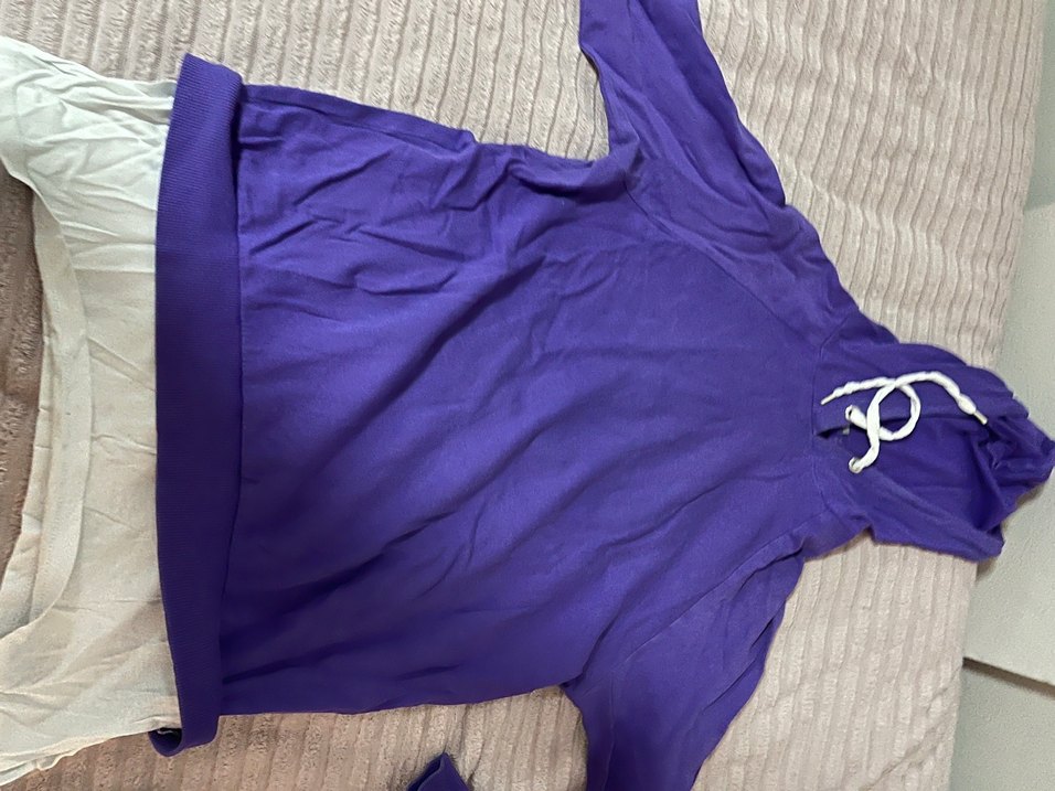 Mor keten kumaştan, V yakalı, uzun kollu, bol kesim ve drapeli hamile gömleği. Günlük kullanıma uygun.