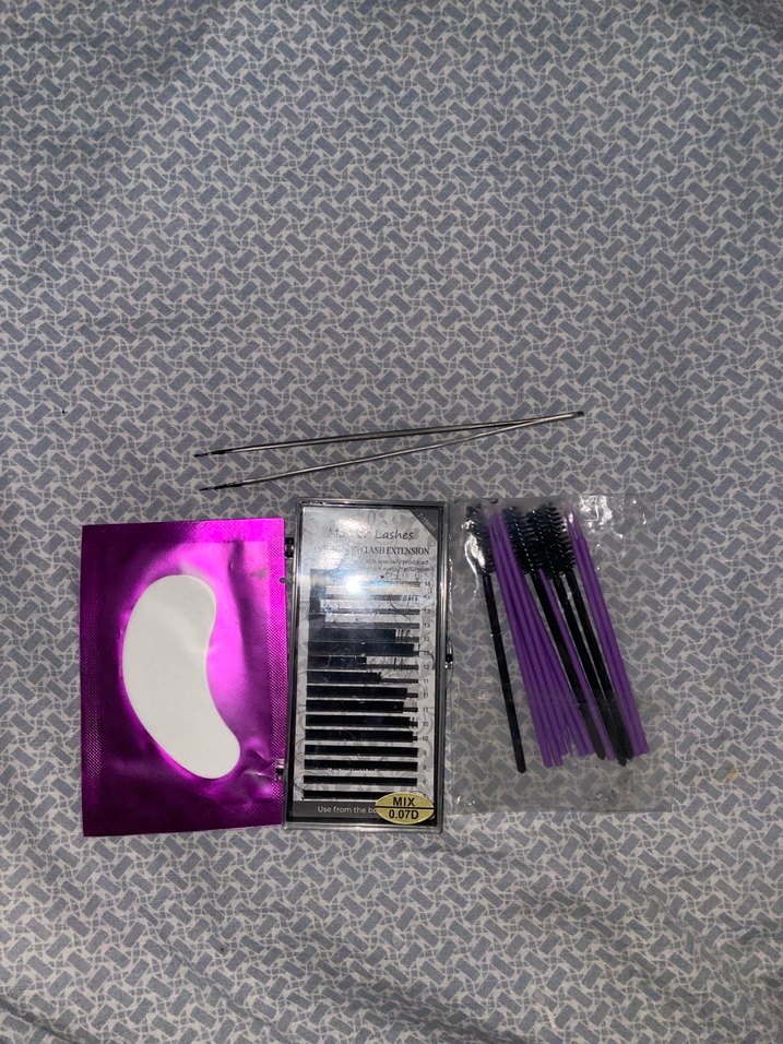 Mor renk takma kirpikler ve uygulama için fırça, yapıştırıcı pedleri içeren set. Detaylı göz makyajı için uygundur. ️