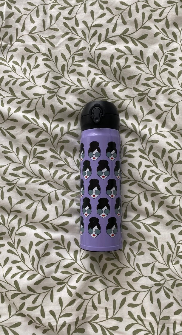 Koyu mor renkli termos şişesi, siyah kapaklı ve eğlenceli çizgi yüz desenleriyle içecekleri sıcak veya soğuk tutar. İçi temiz ve kokusuzdur. Kapağı sağlam ve sızdırmaz. 5 saat soğuk sıcak tutar.