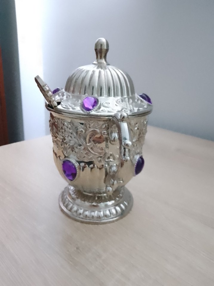 Kapaklı ve kaşıklı, mor taşlı ve işlemeli desenlere sahip parlak gümüş şekerlik.