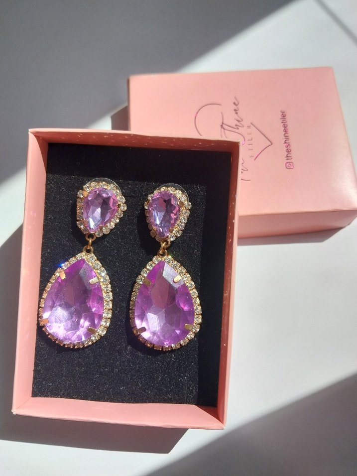 Mor taşlarla çevrili pullu küpeler, modern klasik tarzda, romantik akşamlar için kısa ve şık bir seçenek sunar. Sadece 1 kez kullandım düğün kombinine uyuyorsa al.