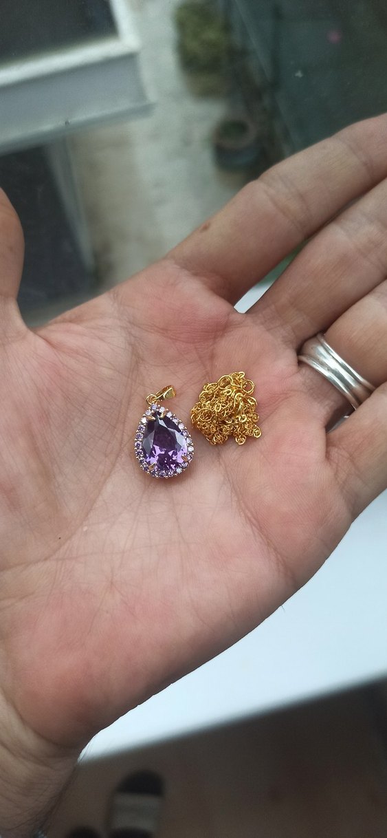 Mor taşlı, pullu damla şeklinde kolye ucu ve altın renk zinciri ile sade ve bohem tarzda, günlük kullanıma uygun midi uzunlukta kolye.